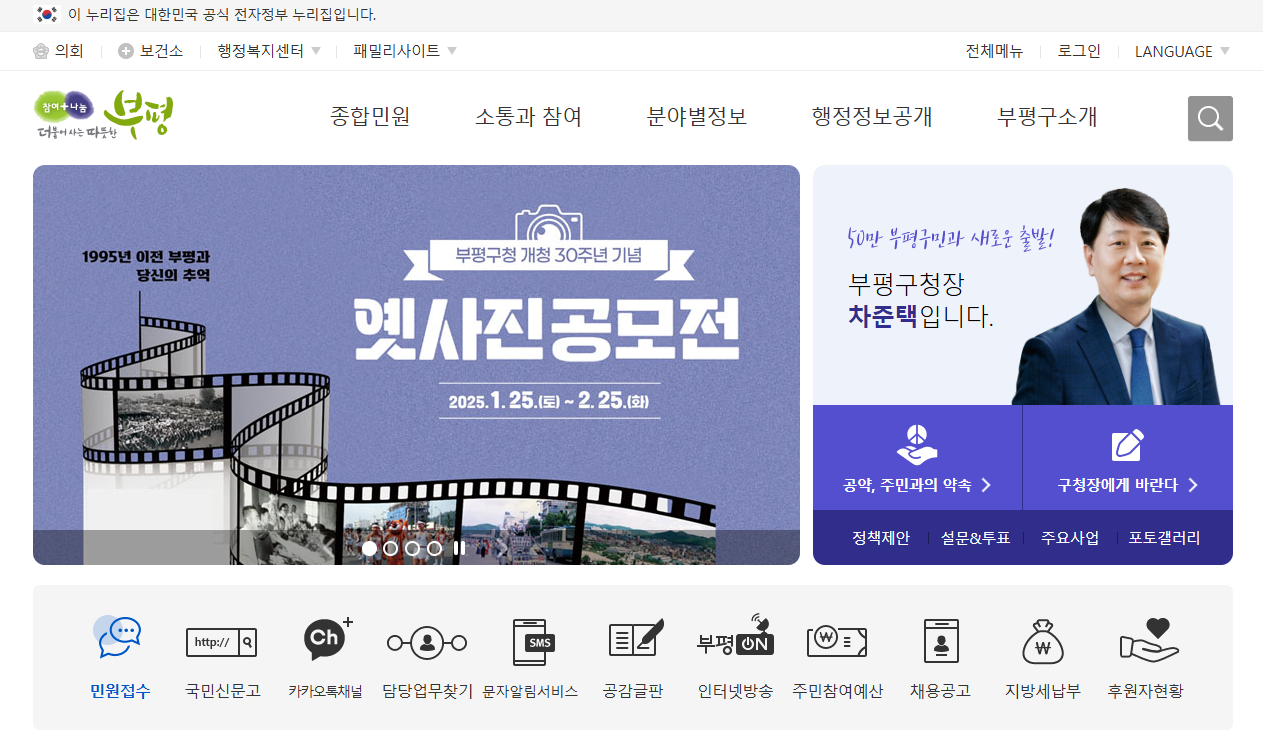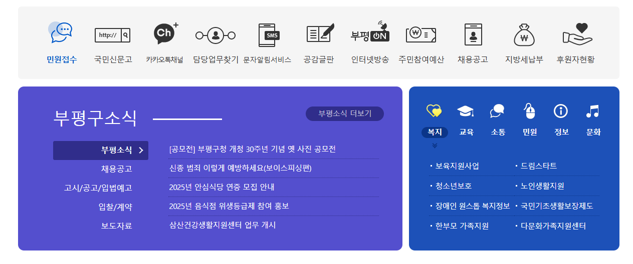 부평구청 홈페이지는 다음과 같은 주요 메뉴로 구성되어 있습니다.